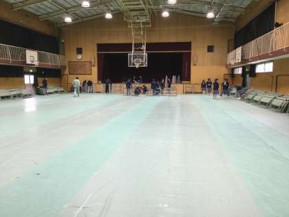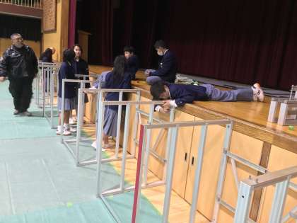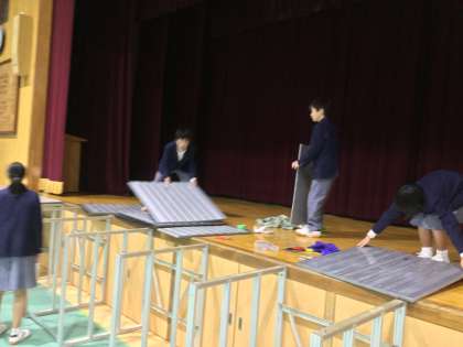 きれいにシートが張られた後は、張出舞台の設営です。組み立て式で生徒達もボルトを締めたり、パネルを載せたりと大活躍でした。