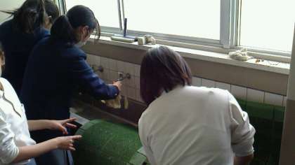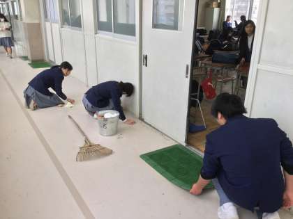 最後に足ふきマットを丁寧に洗ってから、雑巾で磨かれた教室の入り口の床面に置かれました。