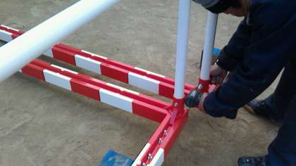 従来から使用していたハンドボールゴールが、錆びて腐食しており危険なため購入していただきました。従来の物は鉄製でしたが、今回納入されたものはアルミ製です。グラウンド隅での納入業者さんによる組み立て作業でした。