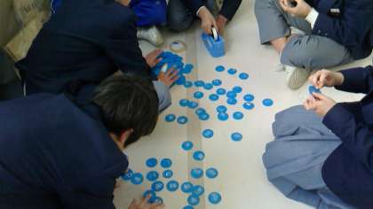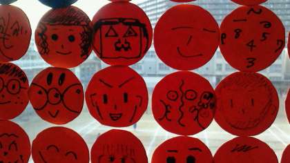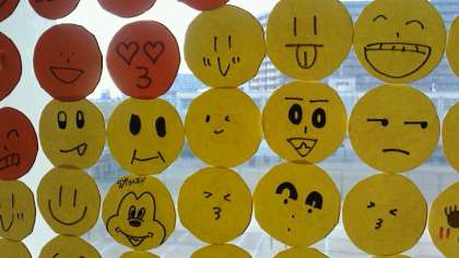 丸く切り取った画用紙には笑顔のイラストが描かれてありました。虹色のカラフルな画用紙が使われ、裏面にセロテープを利用していました。