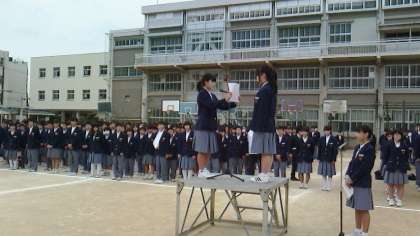 朝礼台上では、在校生代表から卒業生代表に「在校生から卒業生へ記念品を贈呈します」と目録が渡されました。