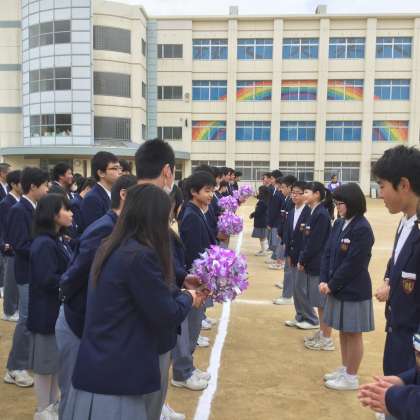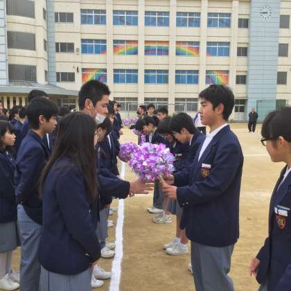 2年生のクラス代表が、3年生の前に進み、3年生クラス代表に花を手渡ししました。