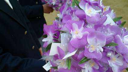 記念品の花は、メッセージ付きの色鮮やかな紫色の花でした。明日の卒業式では、胸元を飾ることになります。