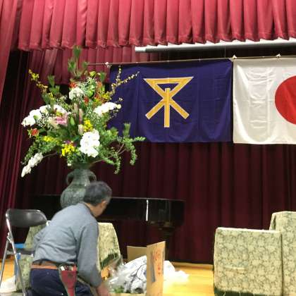 体育館では予行等での汚れを清掃し、椅子を並べ直し、3壁面の紅白幕もスムーズに設営していただきました。舞台を飾る盛り花も、生花店により豪華に生けていただきました。