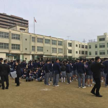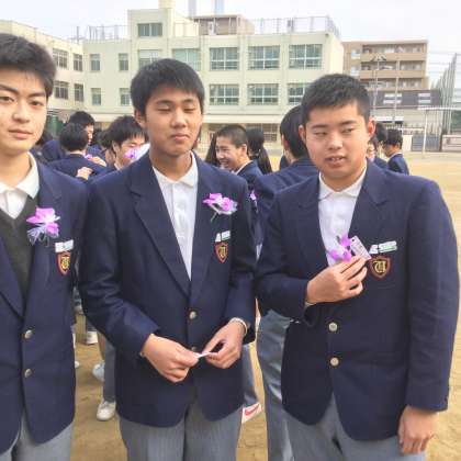 卒業生は体育館横のグラウンドに集合しました。昨日在校生からいただいたお花を、胸元に取り付けていました。