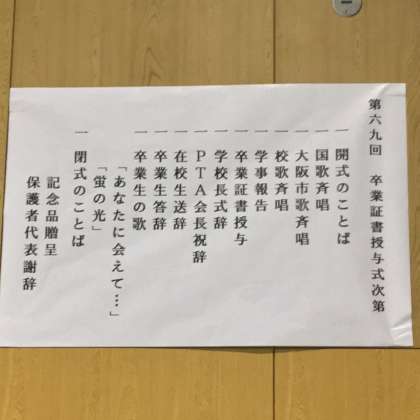 体育館では在校生の代表、保護者、来賓の入場が進んでいます。間もなく卒業生の入場となります。