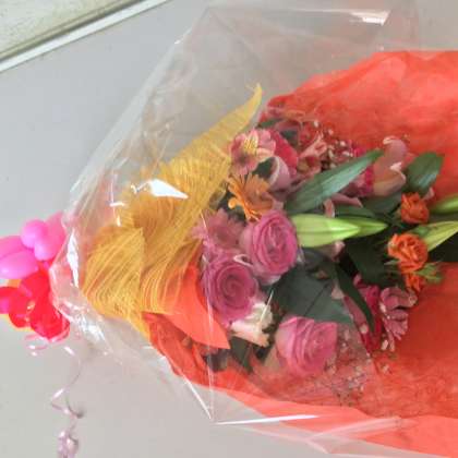 きれいにアレンジされた花束には、満開の花びらと、つぼみがバランスよく配置されていました。