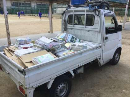本日古紙回収業者の方が来られて、多くの先生方に協力をいただいての積込み・搬出作業を行いました。山もりの軽トラック3・5台分の搬出となりました。