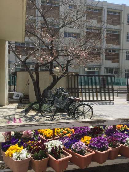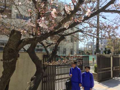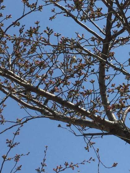 4月3日(月)の玄関の桜の状況です。4月1日(土)には、数輪が開花している状況でしたが、昨日の暖かさで開花が進み、地面に近い方の枝では結構咲いています。