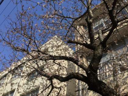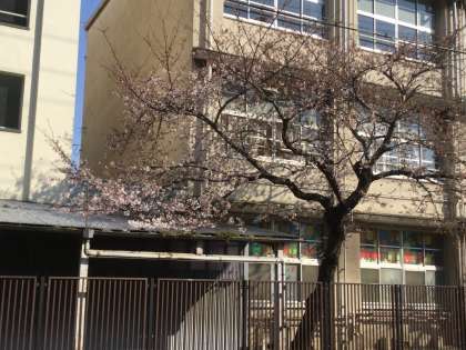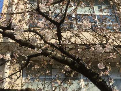 4号館道路側で緑陰道路に面した美術室前の桜が、朝に比べて午後にはたくさん咲いていました。4号館の建物に風を遮られ、西日をたっぷり浴び心地よかったんだろうね。
