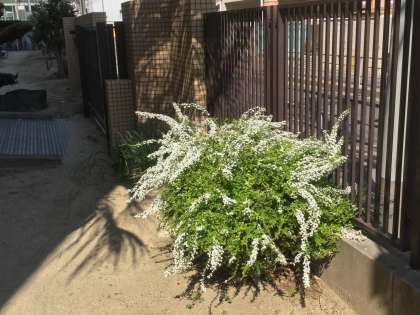 1号館の道路側の柵に寄り添うように、ユキヤナギの花が咲いています。