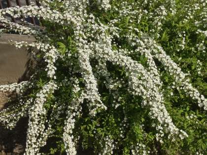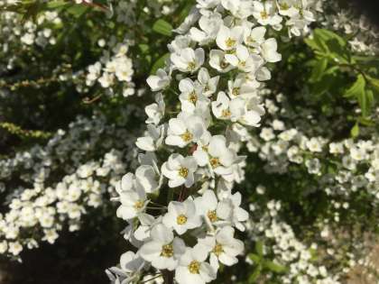 名前のごとくまるで雪が降っているかのように、垂れた枝に美しい白い花がびっしり咲いています。枝の数も多く、幾筋にも咲いている花は緑の葉っぱとの対比で、より引き立って見えます。