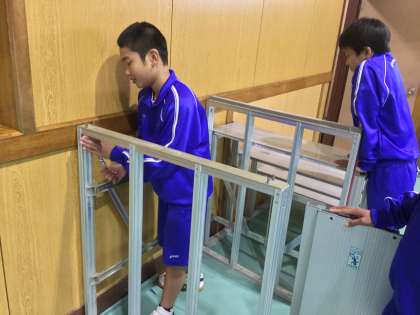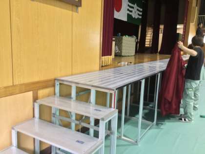 舞台に接続する張出舞台では、骨組みの組み立て作業でも、生徒が協力してボルトを締めつけていました。足元の幕の取り付け作業でも、生徒の協力があり手際よくきれいに設置されつつありました。