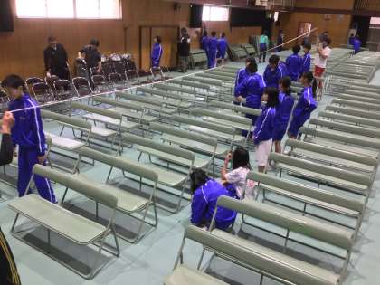イス並べは等間隔になるように、メジャーで計測しながらの作業でした。微調整を繰り返しながらきれいに並べられました。