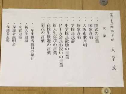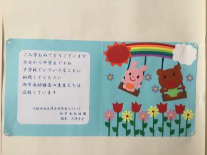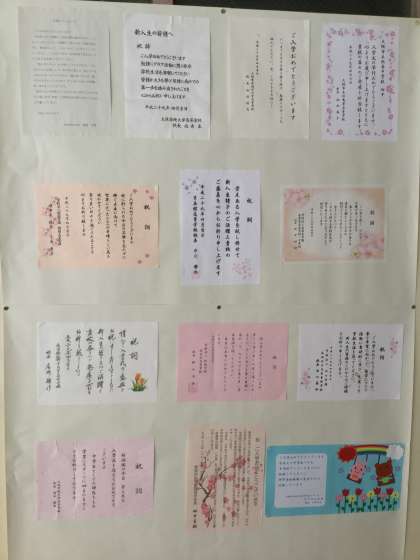 体育館入口では祝電祝辞が掲示されていました。幼稚園からいただいたカラフルなものもありました。