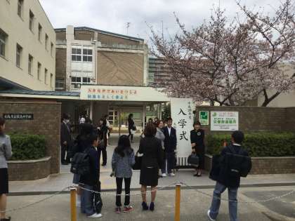 正門わきの桜が、この入学式に合わせたかのように、大急ぎで開花し今日までに5分咲き位までたどり着けたようです。