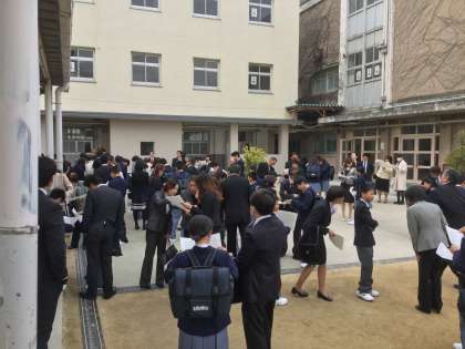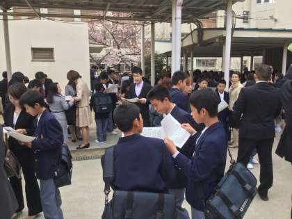 新入生とともに保護者の方も、プリントでクラスの確認をされています。