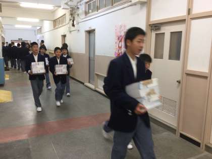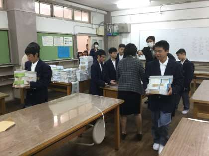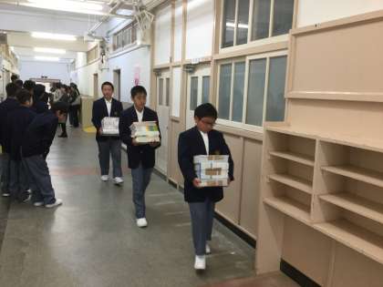 3号館1階の被服室から各教室へ、クラスごとに代表者により教科書が運ばれていきました。小学校と違い教科ごとの先生に変わったりと、学校生活も大きく変わりますね。