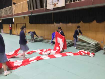 会場設営と逆順で張出舞台の解体から始まり、紅白幕も取り外してきれいにたたまれました。たくさんの長いすも、てきぱきと台車に積み込んで舞台下へと収納されました。新調なったフロアーシートも、掃除機できれいに汚れを取ってから収納されました。