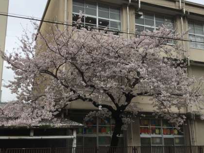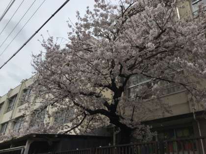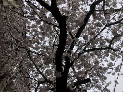 4号館の緑陰道路側の桜が満開となっています。太い幹の高木で幾重にも枝を広げて、どの枝も満開となっています。根元から見上げると、あまりに花びらが多く薄暗さえ感じます。まさに「満開の桜」です。
