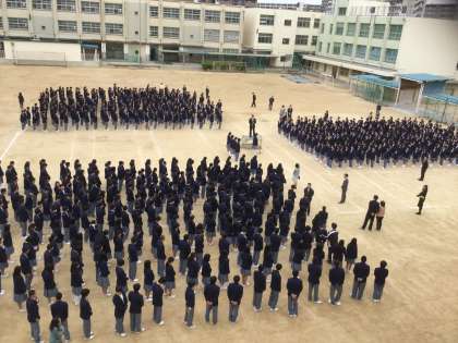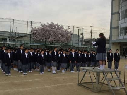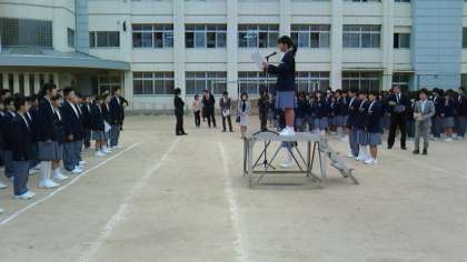 グランドで2・3年生徒と新入生が相向き合うかたちで対面しました。