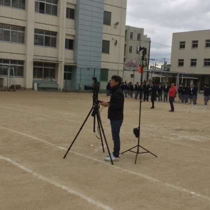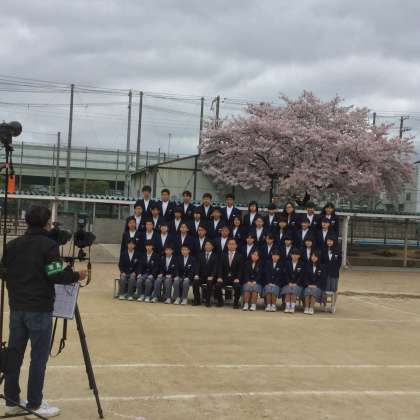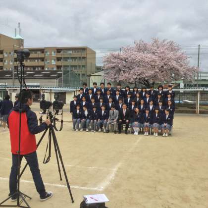 生徒達の記念の学級写真に、見納めの桜の思いとともに納めていただきました。生徒のブレザーの紺色と桜の花びらの淡いピンク色の対比が、何とも言えぬバランスを醸し出していました。雛壇では高低差を利用して4段に並んでいました。