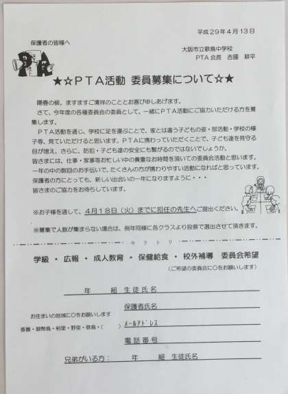 本日子供さんを通じて 「★☆PTA活動 委員募集について☆★」 を配付させていたいただきました。