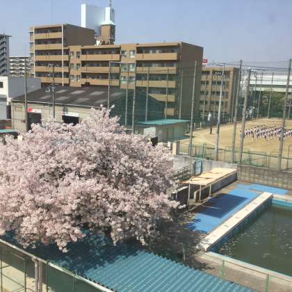 桜とプールの向こうにある第2グラウンドでは、同じく女子の授業があり、きれいに整列していました。