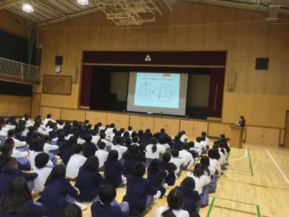 5月9日(火)の6限目、1年生の総合の時間に「着こなしセミナー」がありました。制服メーカーの方にお越しいただき、正しい制服の効用・着用法の講演をしていただきました。