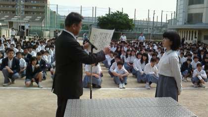 5月15日(月)さわやかな風がゆるやかに流れるグラウンドで、全校集会が行われました。