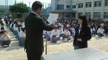 全国学校図書館協議会による読書感想画の中央コンクール中学校の部での奨励賞の表彰がありました。また大阪市中学生バレーボール交流大会にてUリーグ優勝の表彰もありました。おめでとうございます。