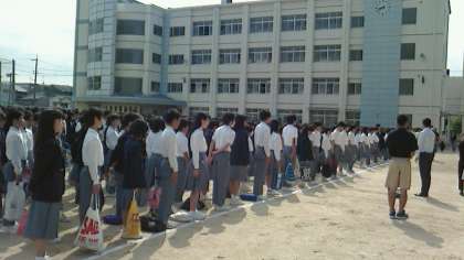 生徒は、朝礼台の方向に向きを変えて正対して、話を聞いていました。