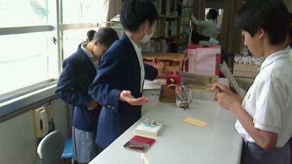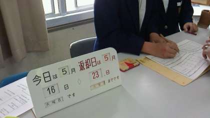 開館は文化委員の生徒と図書室担当の先生方が協力して開いています。文化委員の生徒が貸出・返却手続きの担当者です。先生方に作業手順を教えていただき貸出・返却業務をしていました。