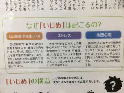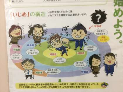 いじめを無くすためには、いじめの構造を理解する必要があります。イラストで説明されていました。