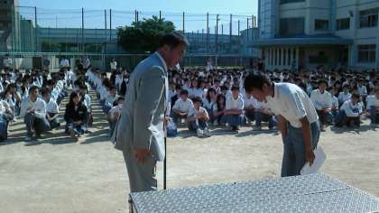 5月22日(月)6月のような気温での全校集会でした。全校集会に先立ち陸上大会での表彰状の披露がありました。