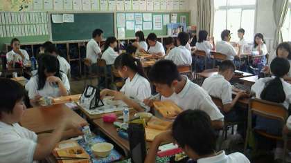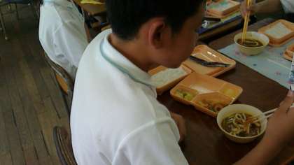 選択制の給食で、持参弁当と中学校給食(デリバリー方式)との人数は半々のようでした。机を引っ付けて班単位の給食です。担任の先生に汁わんに「カレーだし」を分けていただいて、準備が揃ったところでいただきます。