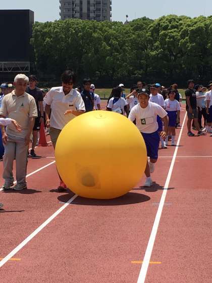 大玉ころがしでは、前が見えないにも関わらず、先生と協力してうまく転がしていました。
