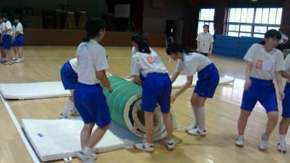 6月7日(水)の6時間目に講堂にて、教育実習生による2年生女子を対象にした、保健体育科(マット運動)の研究授業がありました。