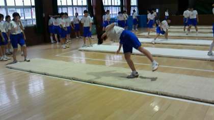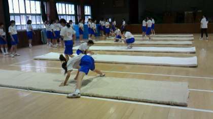 6mのロングマットを6列に並べてから安全点検後に練習開始となりました。前転・後転・開脚前転・開脚後転・伸膝後転・伸膝前転・側方倒立回転・倒立前転の練習がされていました。