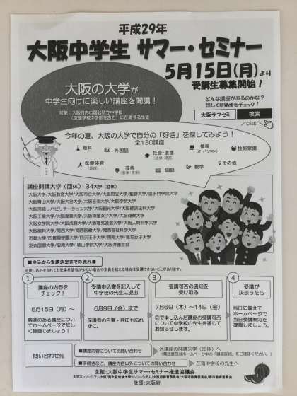 「大阪中学生サマー・セミナー」の締切が6月9日(金)となっています。申し込みをお考えの方は、明日までに「平成29年大阪中学生サマー・セミナー受講申込書」を担任の先生に提出してください。