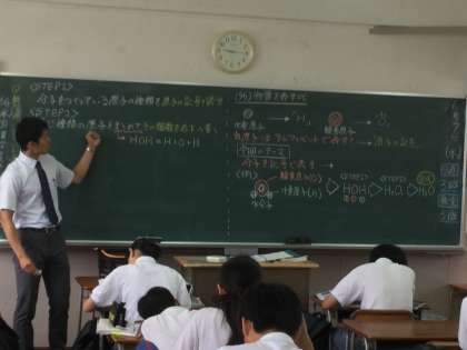 「化学変化と原子・分子」の単元で、今日は「物質を表す式」の研究授業でした。原子の記号を使って物質を表すには、どうすればよいかということを学んでいました。