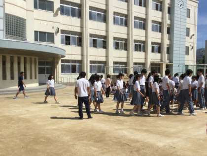 連続ベルと放送を使用して、担任の誘導で避難経路に沿ってグランドに避難し、委員長が点呼をして担任の先生に報告をしていました。安全確認後にはクラス単位で腰を下ろしていきました。