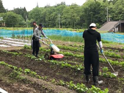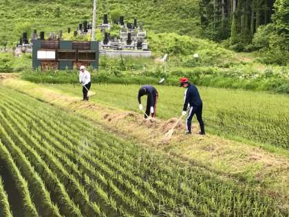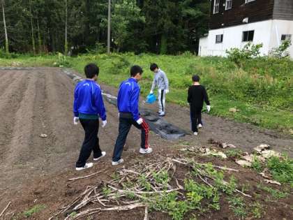 畔(あぜ)の草刈り後の草集めは、見た目以上に重労働のようです。畝の土寄せの大変さも経験しましたね。