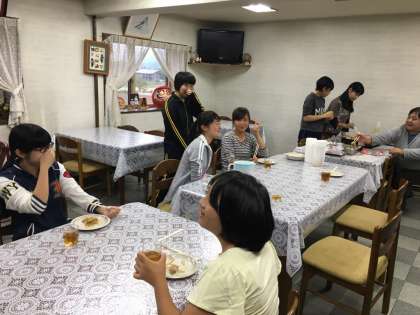 薪ストーブの前で記念撮影しているのは、農作業を終えたばかりの班です。