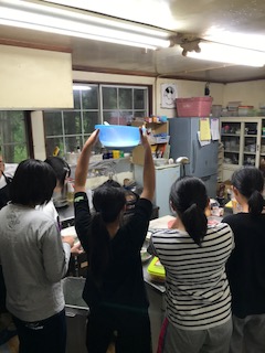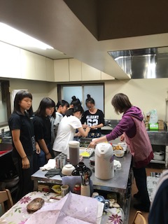 3組の女子が、晩御飯作りのお手伝いをしています。クレープ作りもします。