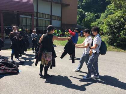 バスにてインストラクターの方の説明を聞いてから、ウエットスーツを受け取り、ライフジャケットやヘルメットを身につけて準備します。