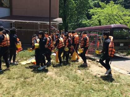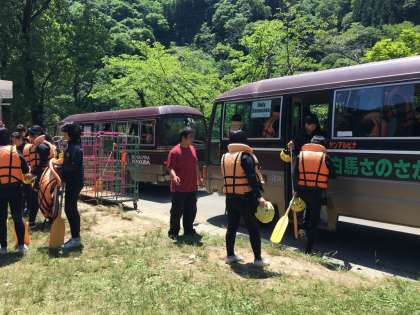 マイクロバスから降りて、パドルやライフジャケットを返却します。