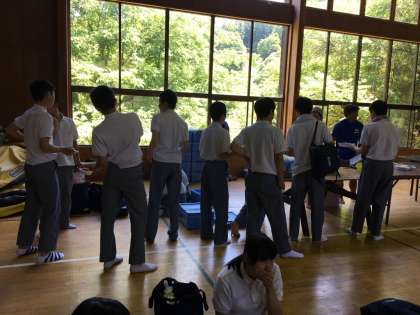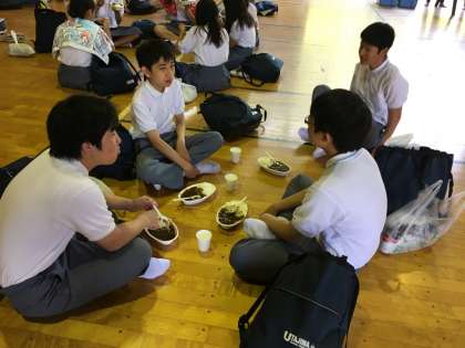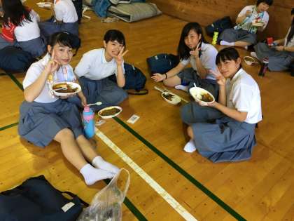 シャワーを浴びて、制服に着替えたあとは、体育館でカレーをいただきます。