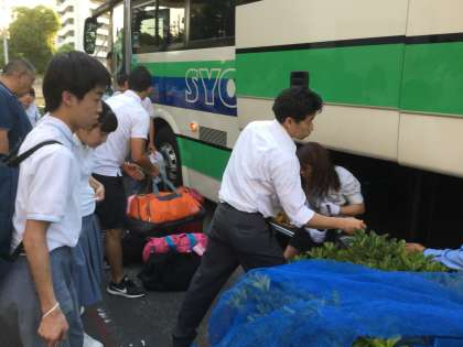 到着とともに生徒達も降りてきました。早速乗務員さんに、トランクルームからカバンを取り出していただきました。