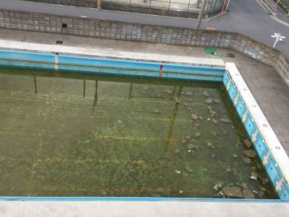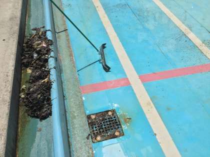底面に溜まった、腐敗した葉っぱに砂ぼこり交じりの黒く濁った水を、ドライヤーで排水口に集めていただきました。さくらの葉っぱも半年水の中に沈み込むと、相当分解が進んできており、プールサイドにまとめました。